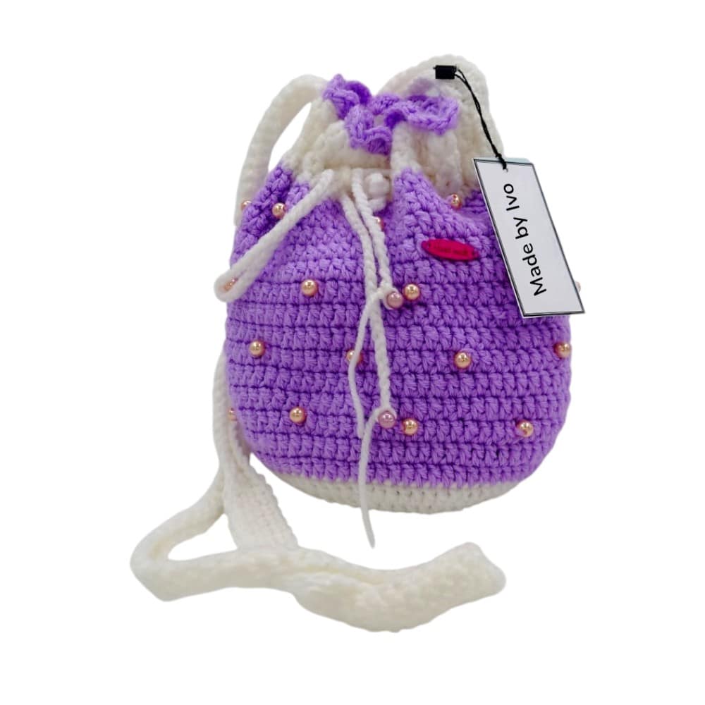 Ръчно плетена чанта, тип торбичка с дълга дръжка и декорация.
