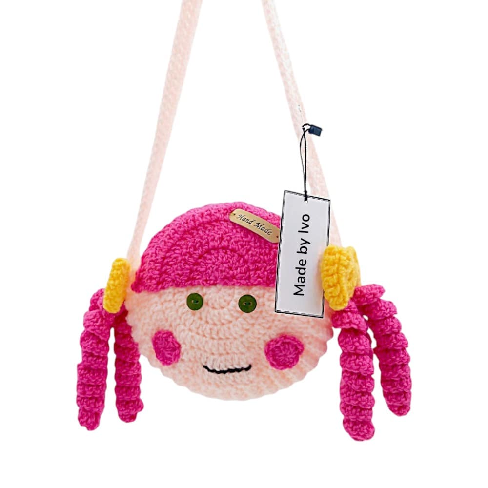 Ръчно плетена чантичка, с дълга дръжка и декорация.