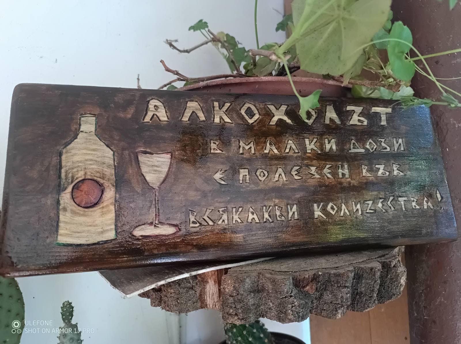 Ръчно изработена върху опушено дърво табела с майтапчийски текст.