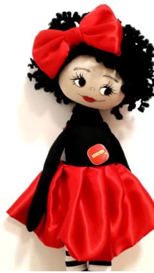 Тази кукла е ръчно изработена от памучен плат и пълнеж от силиконов пух. Лицето е рисувано на ръка с водоустойчиви акрилни бои. Куклата има естествено къдрава черна коса от прежда-мохер. Ръцете са подвижни, закрепени със здраво зашити копчета. Полата и диадемата са подвижни.