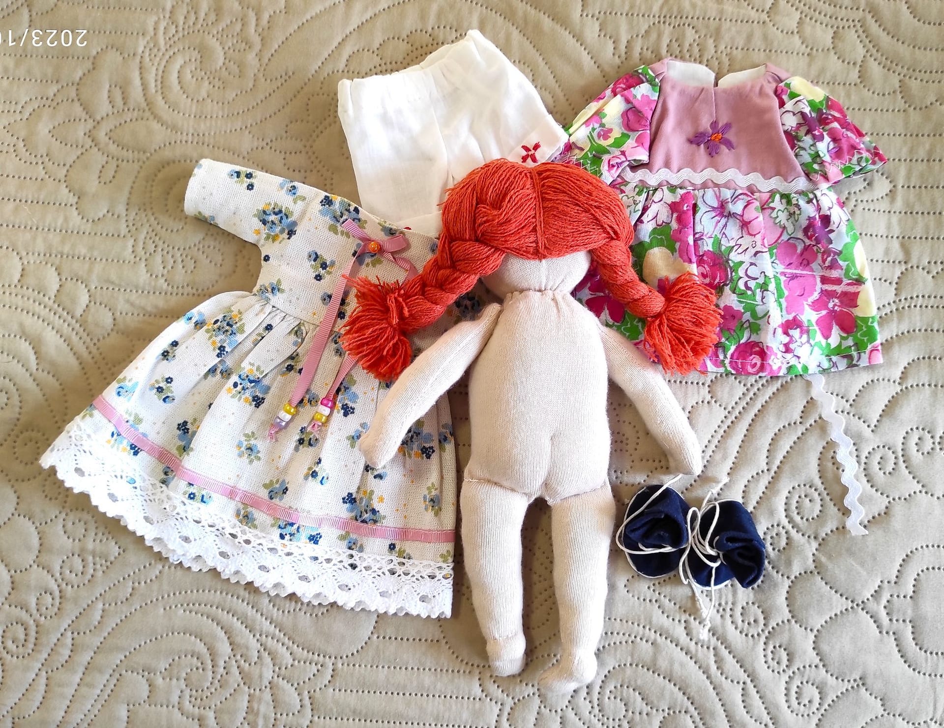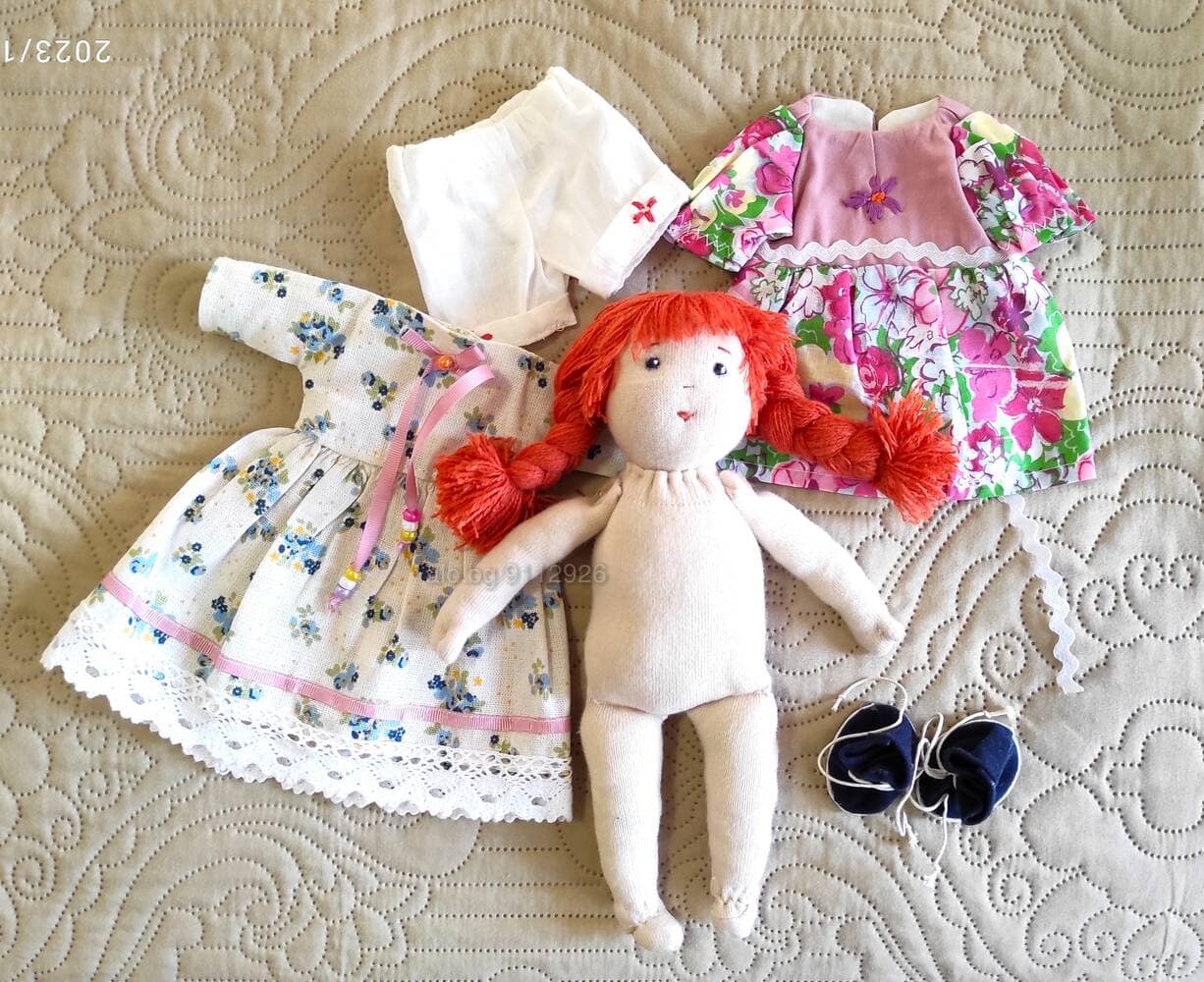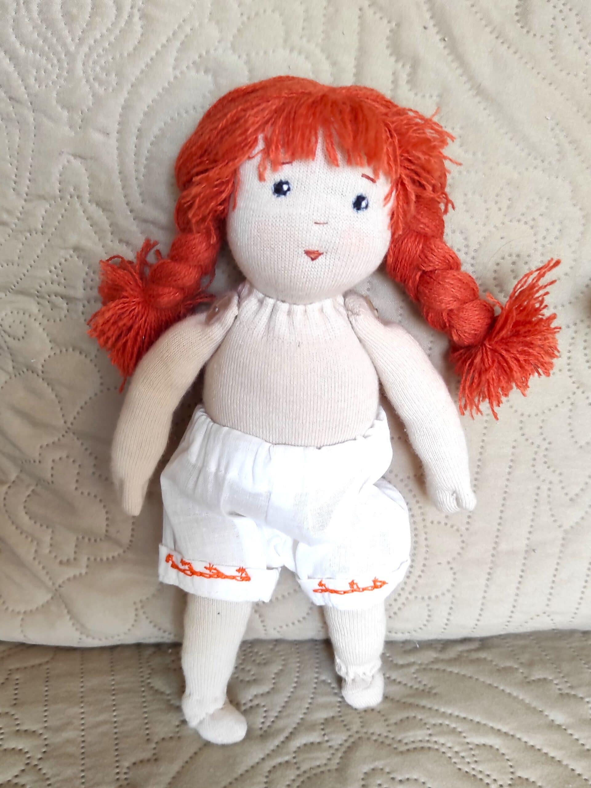 Краката и ръцете на куклата се въртят. Очите, носът и устата на куклата са бродирани с конец.