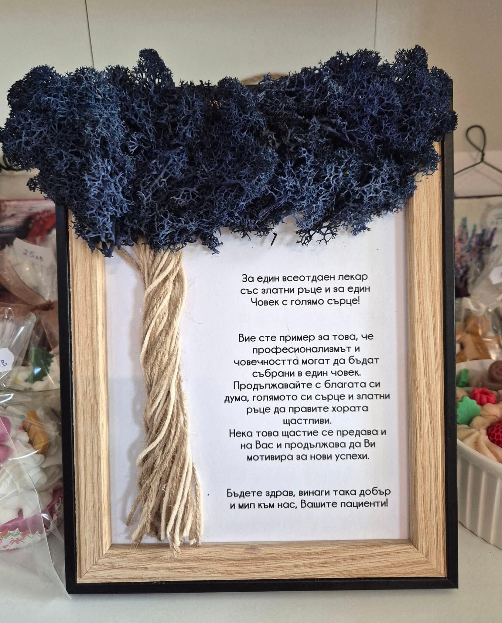Направете празника незабравим с персонализиран комплект! Картината представя стилна дама с рокля от жив скандинавски мъх, допълнена от ръчно декорирана чаша с цветя от полимерна глина. Комбинация, която съчетава практичност и изкуство. Може да се изработи с име по ваш избор.