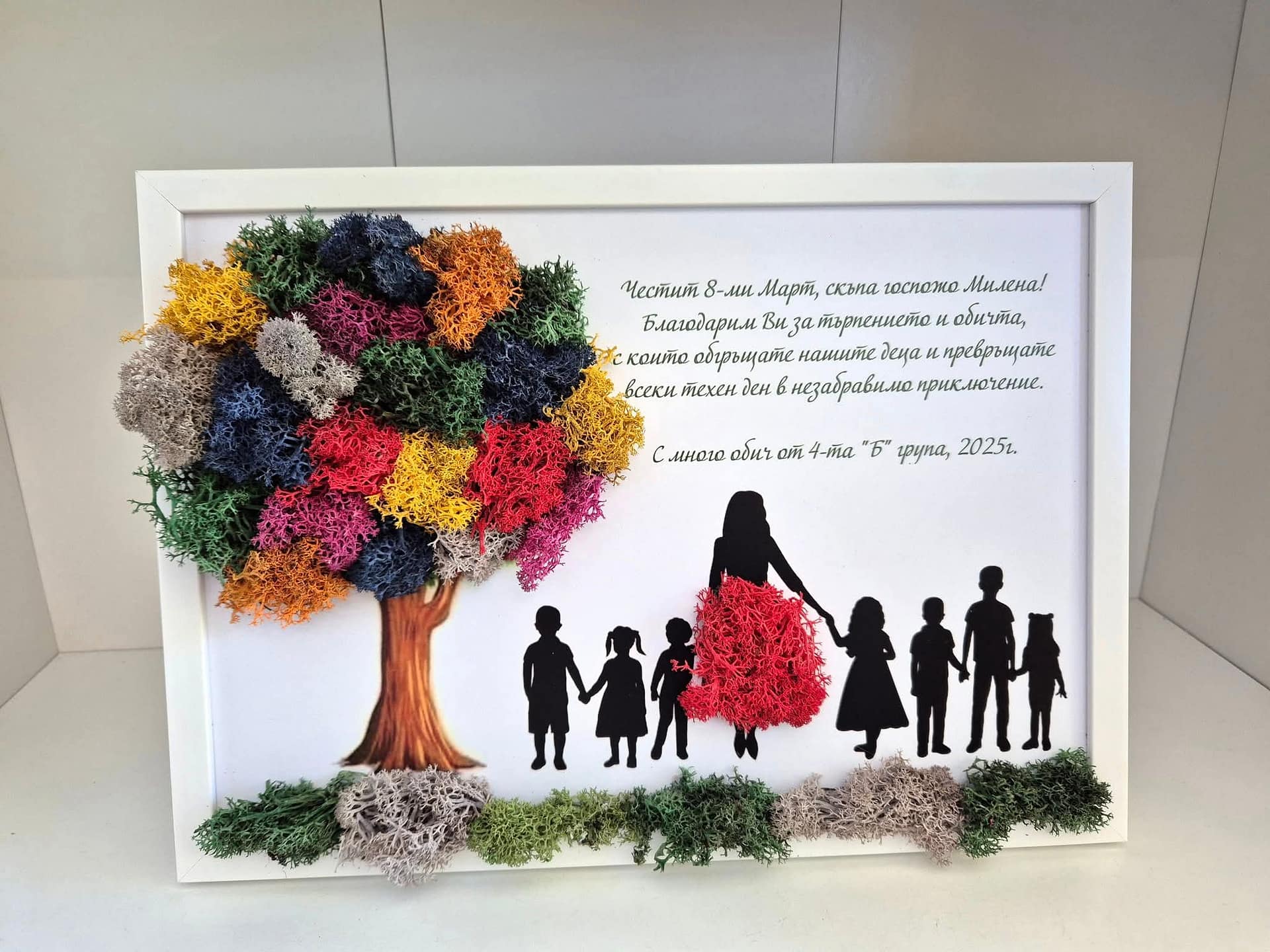 Красив и траен начин да кажете „Благодаря!“. Това пано символизира грижата и търпението на учителя, представени чрез короната на многоцветно дърво и силуети на деца. Скандинавският мъх остава мек и свеж с години, напомняйки за обичта на вашите деца. Чудесен избор за завършване на учебната година или Първи юни.