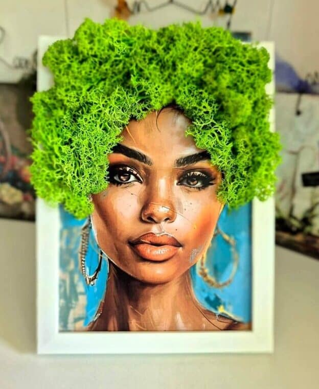 Внесете стил и природа във вашия дом с тази уникална картина с ръчно апликиран скандинавски мъх. Комбинацията от изящни женски черти и наситено зеления обем на мъха създава 3D ефект, който приковава погледа. Идеален подарък за рожден ден, юбилей или нов дом. Мъхът не изисква поливане и пречиства въздуха.