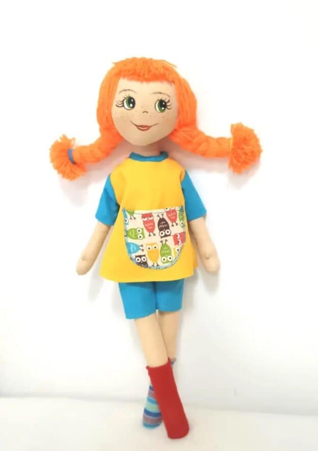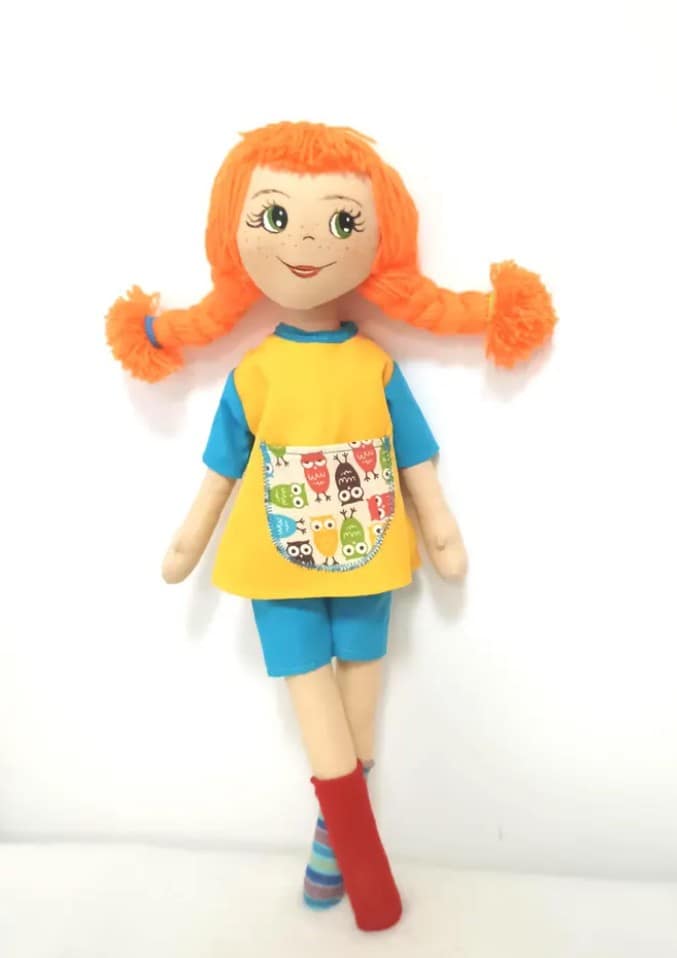 - Текстилна кукла Пипи Дългото Чорапче. Ръчно изработена от памучен плат, силиконов пух за пълнеж, коса от прежда. Лицето е изрисувано ръчно с текстилни и акрилни бои. Височина 45 см. Дрешките могат да се събличат.