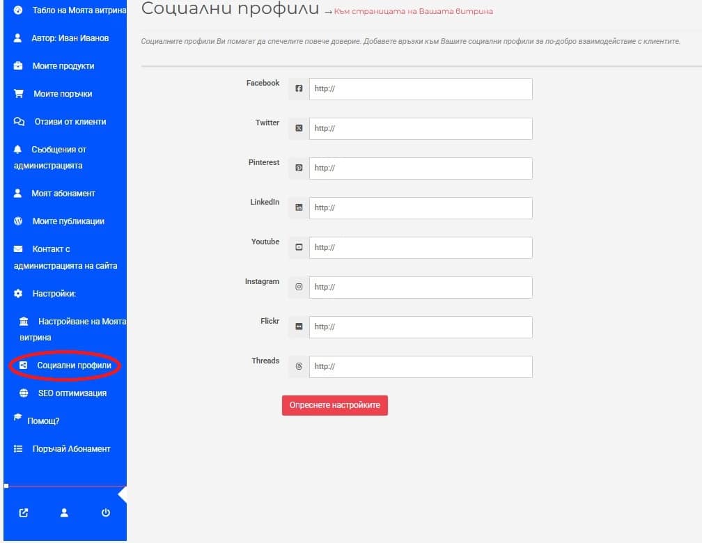 Вашите социални профили помагат на клиентите да Ви откриват по-лесно и да взаимодействат по-лесно с Вас. За да дадете връзки към Вашите социални профили, изберете менюто Социални профили в лявото синьо поле. Ще бъдете прехвърлени на страницата Социални профили, където можете да напишете интернет адресите на Вашите социални профили (Фиг. 10).
