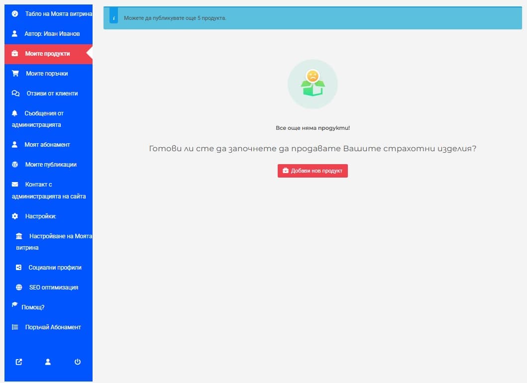Докато Вашият абонаментен пакет не бъде активиран, ще виждате надпис в горното синьо поле, който Ви уведомява, че не можете да публикувате продукти, докато не поръчате абонаментен план. След заплащане и активиране на абонамента синьото поле ще показва броя продукти, които можете да публикувате, съгласно избрания от Вас абонаментен план.