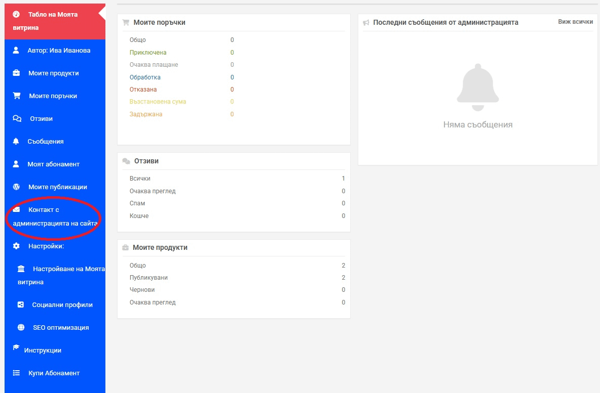 За да улесним Вашата работа, добавихме в таблото на Моят магазин ново меню „Контакт с администрацията на сайта“ (Фиг. 35).