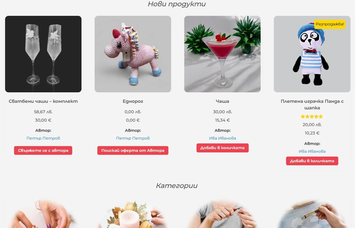 Продуктите, които са без цена имат бутон „Поискай оферта от Автора“.