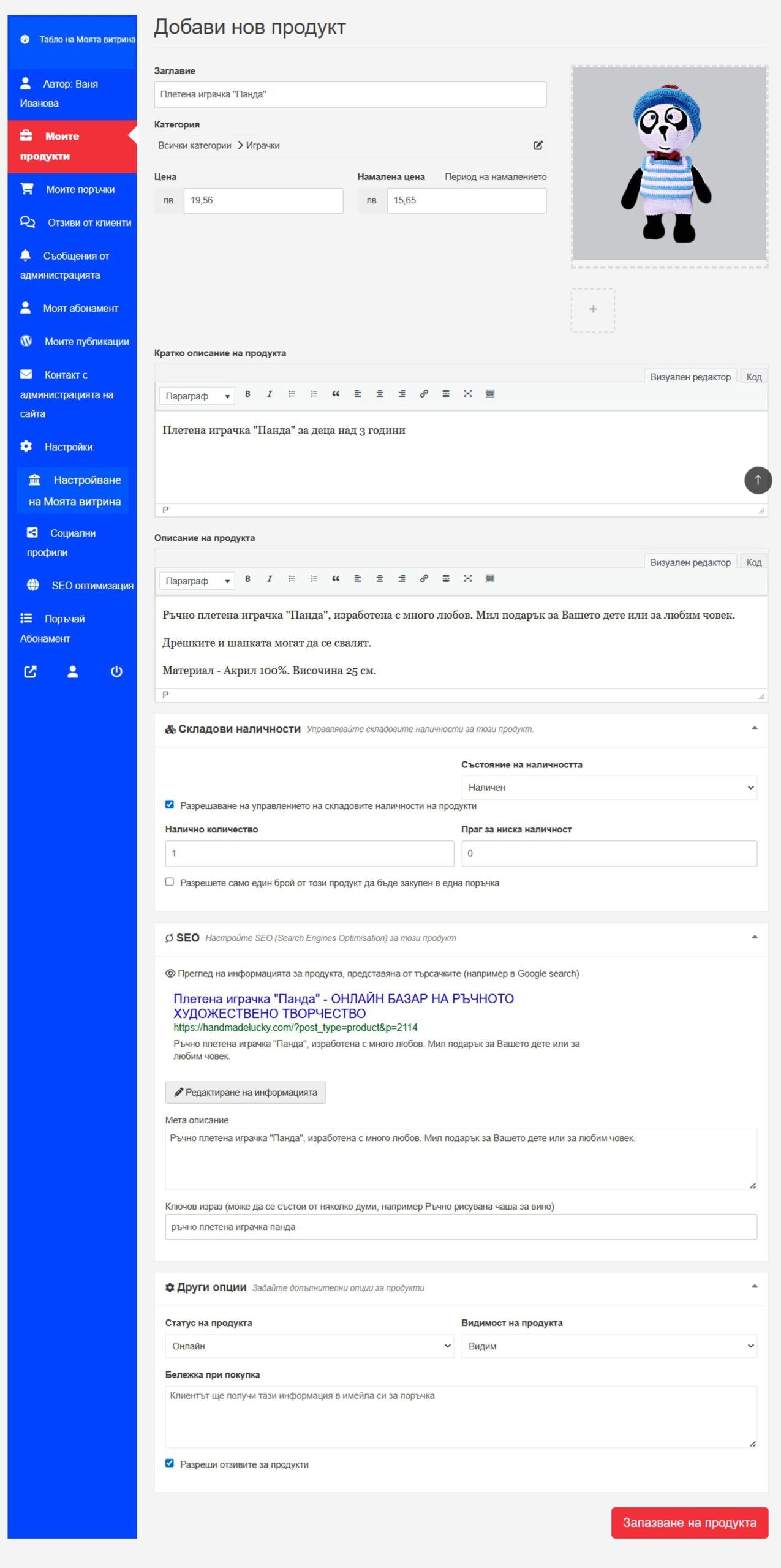 Изберете Запазване на продукта и готово! Вашият уникален продукт вече е онлайн и очаква клиенти (Фиг. 21, 22).
