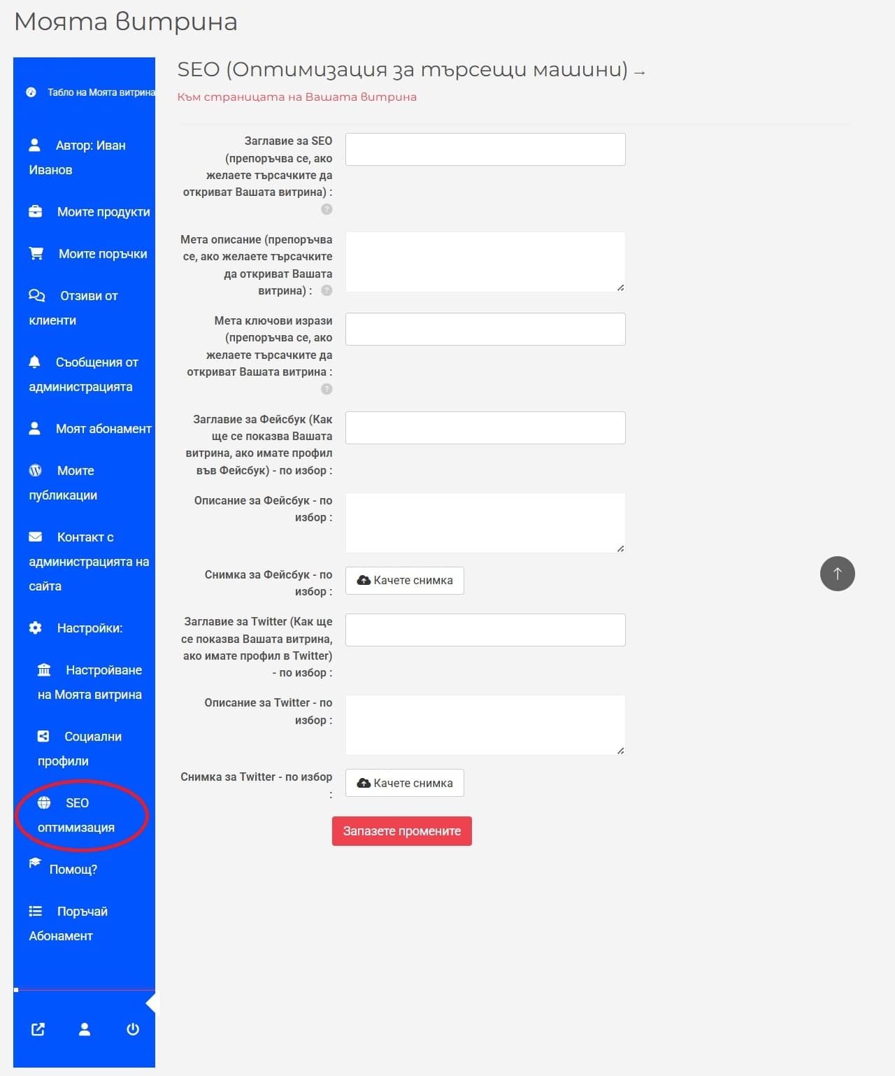В следващите полета въведете заглавия и мета описания за представянето на Вашата онлайн витрина във Facebook (Meta) и Twitter, ако имате профили в тези социални мрежи. Може да използвате заглавието и описанието за търсещите машини от предните полета, които сте попълнили. За Facebook (Meta) и Twitter може да качите и подходяща снимка, представяща Вашата витрина (Фиг. 13).