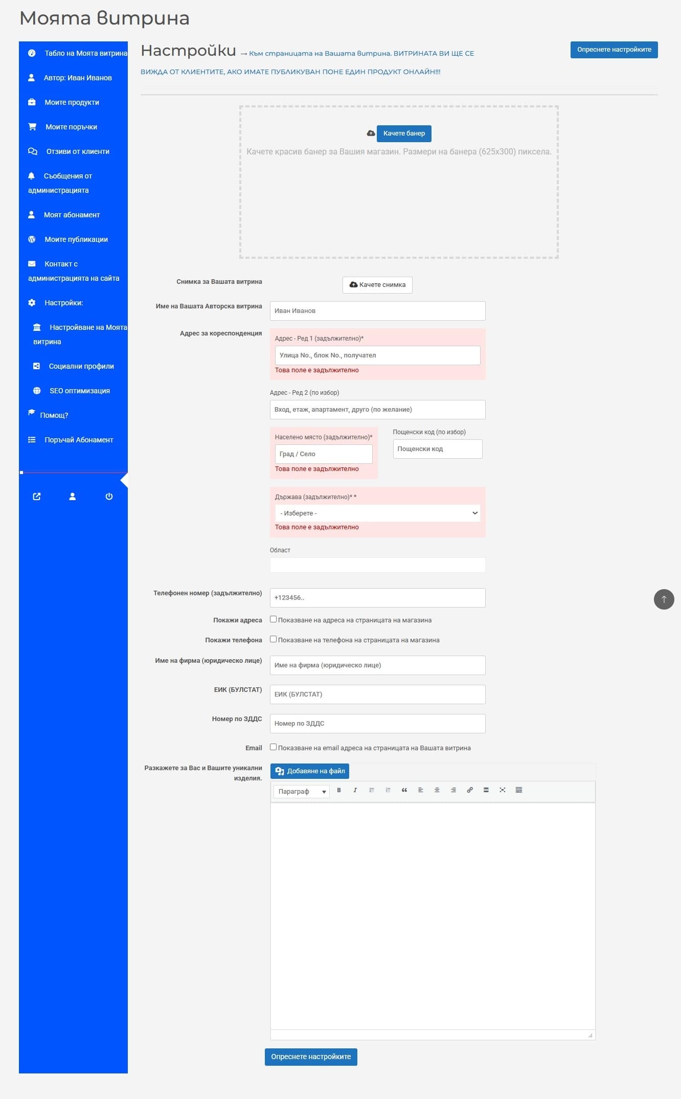На страницата Моята витрина създавате и променяте настройките на Вашия профил и Вашата авторска онлайн витрина.
