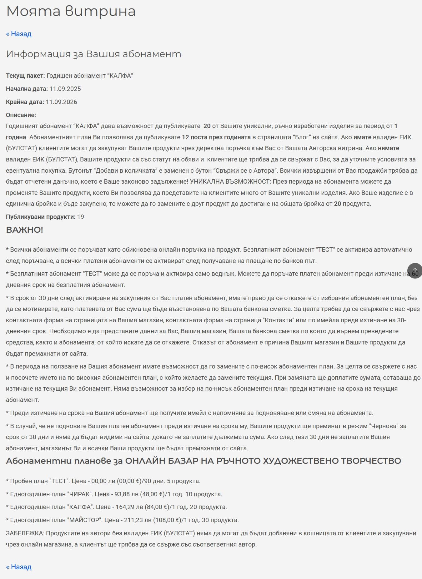 - В случай, че не подновите Вашия платен абонамент, след изтичане на срока Вашите продукти ще преминат в режим "Чернова" за 30 дни и няма да бъдат видими на сайта, докато не закупите абонаментен план. Ако и след тези 30 дни не закупите абонамент, Вашата витрина и всички Ваши продукти ще бъдат премахнати от сайта.