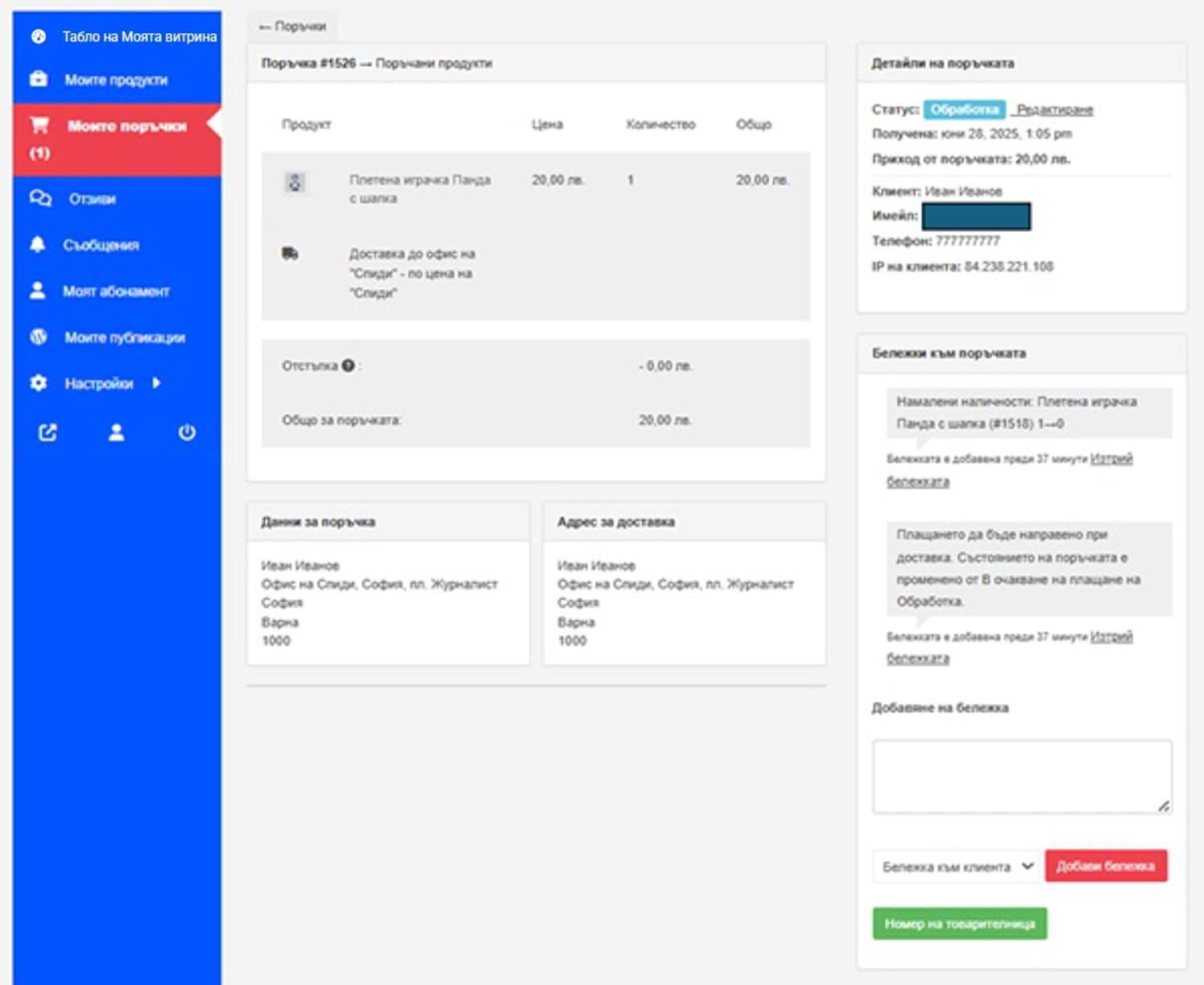 От страницата на поръчката можете също така да изпращате бележки към Клиента, относно специфики на поръчката, като Клиентът ще получава автоматичен имейл с Вашите бележки или запитвания.
