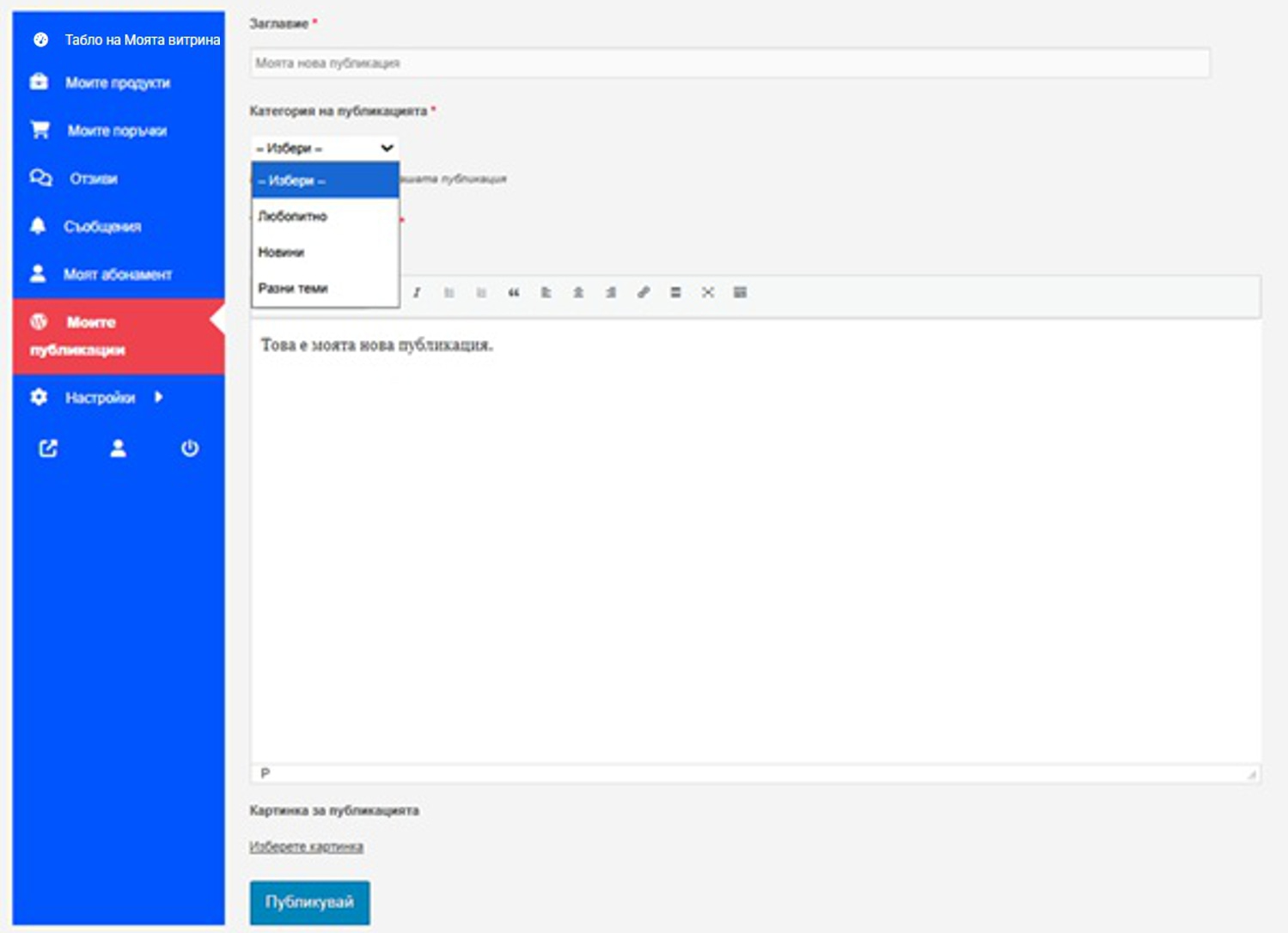 За разлика от всички други платформи, сайтът ОНЛАЙН БАЗАР НА РЪЧНОТО ХУДОЖЕСТВЕНО ТВОРЧЕСТВО Ви предоставя една чудесна възможност за публикуване на Ваши идеи, мисли, съобщения, статии, съвети към Клиентите и към други Автори чрез менюто Моите публикации (фиг. 32). Всеки Автор, закупил платен абонамент, може да публикува 12 публикации годишно (за срока на абонамента).