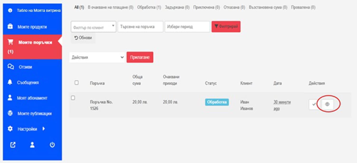 След като получите имейла, влезте с Вашия имейл и парола в административния панел на Вашата витрина чрез менюто Вход Клиенти/Автори в горната част на сайта. След влизането Ви в Моята витрина ще видите, че на главното табло се е появила Нова поръчка (Фиг. 25).