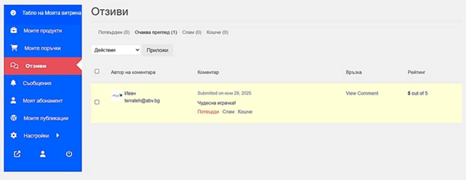 Чрез това меню ще виждате отзивите, които са изпратили клиентите за Вашите чудесни продукти. Можете да потвърдите, да обозначите като Спам или да изтриете отзива (Фиг. 29).