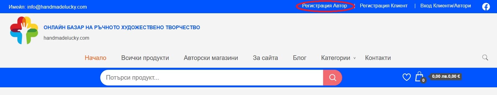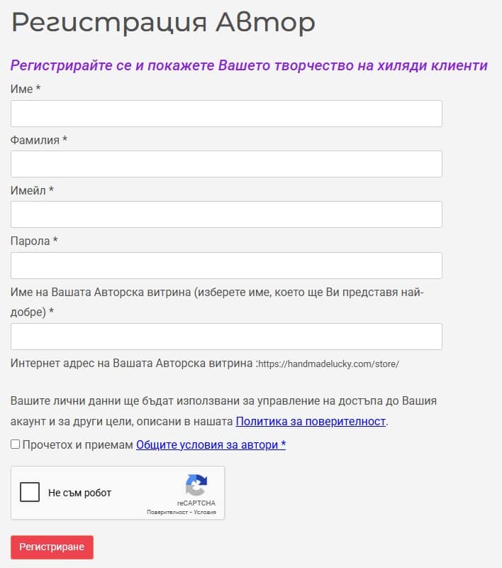 Настоящата инструкция е предназначена за Автори, които желаят да се регистрират и да създадат свой онлайн магазин на платформата ОНЛАЙН БАЗАР НА РЪЧНОТО ХУДОЖЕСТВЕНО ТВОРЧЕСТВО (handmadelucky.com) срещу годишен абонамент. Преди да се регистрирате като Автор, Ви съветваме подробно да се запознаете с Общите условия за Автори .