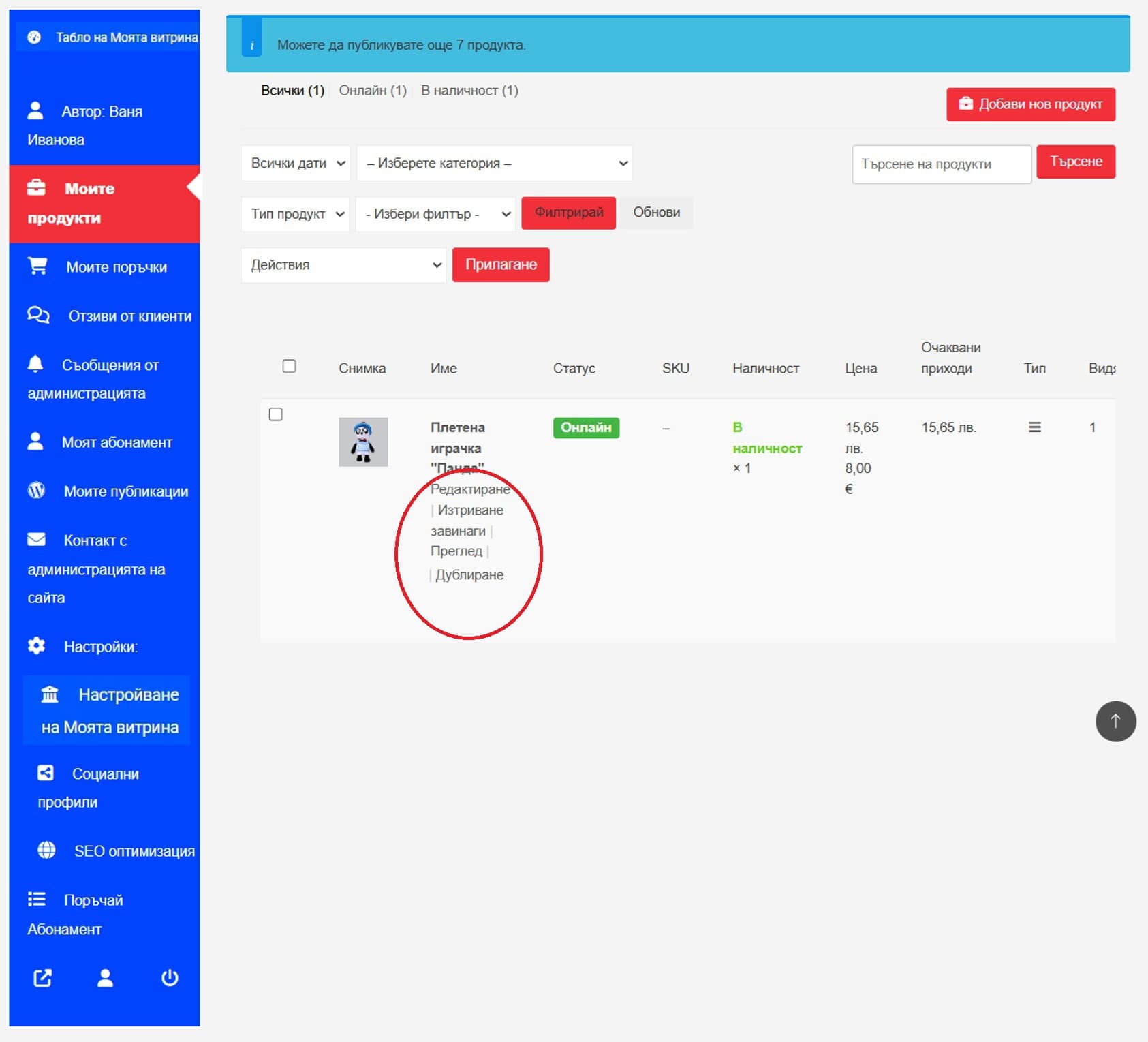 Редактирането, изтриването, дублирането или други действия с продукта можете да правите като отново изберете менюто Моите продукти в синьото поле отляво на Вашия административен панел. Ще видите Вашите публикувани продукти, а в светлосиньото поле отгоре ще има информация колко продукта остават за публикуване, съгласно Вашия абонаментен план.