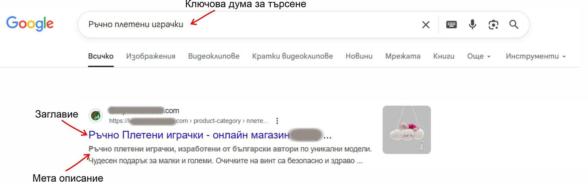 - В следващото поле попълнете, така нареченото Мета описание. Мета описанието най-често се показва като черен текст под заглавието в резултат от търсенето. За да работи, то трябва да съдържа поне една от Вашите ключови думи и да е по-малко от 156 символа. Опишете накратко Вашата витрина, като използвате поне една от ключовите думи от следващото поле.
