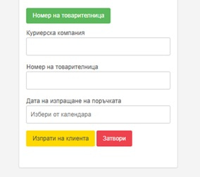 След като изпратите поръчката и получите от Куриерската компания номер на товарителница, изберете зеления бутон Номер на товарителница от страницата на поръчката, попълнете необходимите данни и изпратете автоматично съобщение на клиента (Фиг. 28). Клиентът ще получи автоматичен имейл с данните за поръчката, което увеличава доверието към Вас.