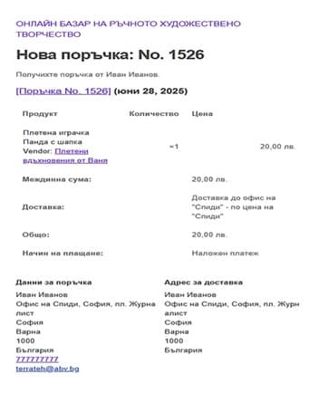 Когато клиент хареса Ваш продукт и направи директна поръчка през Вашата онлайн витрина, което е възможно само ако сте Автор с валиден ЕИК (БУЛСТАТ), Вие ще получите незабавно имейл, изглеждащ приблизително по следния начин (Фиг. 24)
