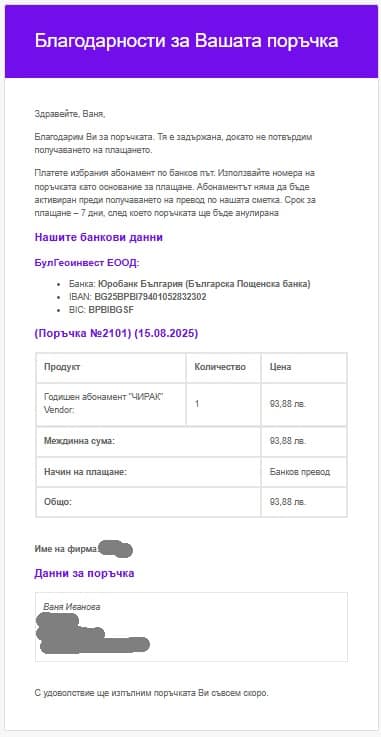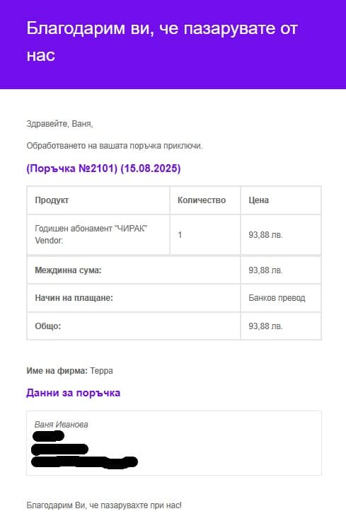 След успешно плащане, Вашият абонамент ще бъде активиран и ще получите имейл за успешно обработена поръчка (Фиг. 18).