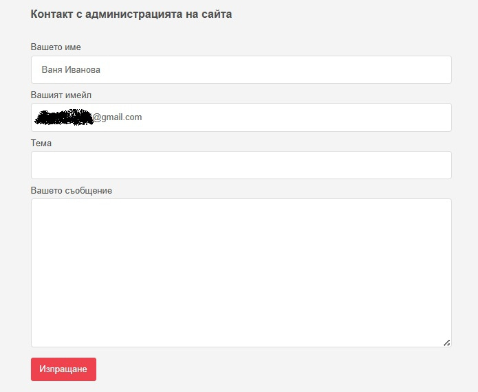 Когато изберете менюто „Контакт с администрацията на сайта“ ще се отвори контактна форма, в която можете да попълните Вашите въпроси към администрацията и да я изпратите, без да се налага да ползвате външен имейл (Фиг. 36).