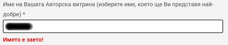 Ако изберете име, което вече е заето от друга Авторска витрина, ще получите съобщение, че името е заето и трябва да изберете друго име, за да можете да се регистрирате! (Фиг. 2а)