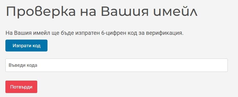След като попълните регистрационната форма и се съгласите, че сте прочели Общи условия за автори, натиснете бутона Регистриране и ще бъдете прехвърлени на страница за проверка на Вашия имейл. На имейла Ви ще бъде изпратен шестцифрен код, който трябва да въведете в полето „Въведи кода“ (Фиг. 2б).